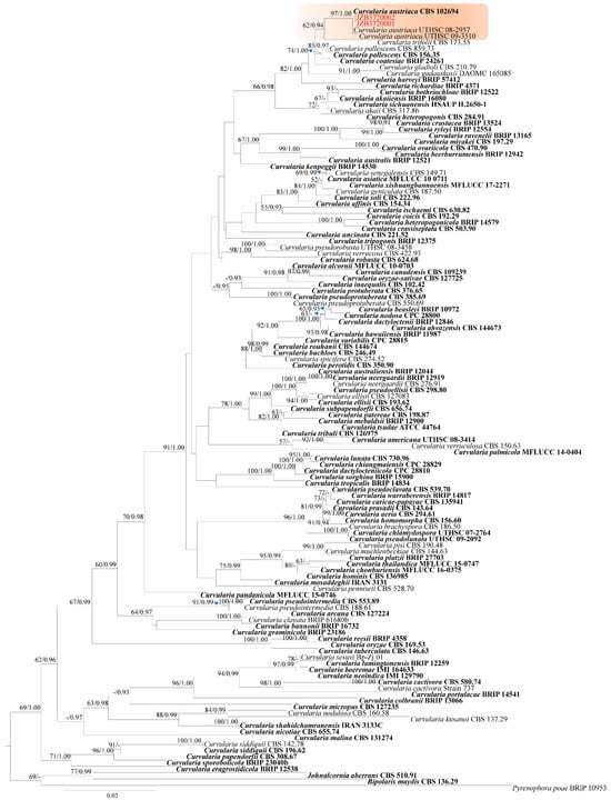 The phylogenetic tree of the combined ITS, gapdh, and tef sequences for Curvularia comprised 124 sequences, representing 115 taxa with Bipolaris maydis (CBS 136.29), Johnalcornia aberrans (CBS 510.91), and Pyrenophora poae (BRIP 10953) as the outgroup [28]. The tree topology of the ML analysis was similar to the Bayesian analysis. The best-scoring RAxML tree with a final likelihood value of −14864.109263 is presented (Figure 4). The matrix had 655 distinct alignment patterns, with 17.23% of undetermined characters or gaps. Estimated base frequencies were as follows: A = 0.228223, C = 0.307112, G = 0.244933, T = 0.219732; substitution rates AC = 1.125622, AG = 4.404677, AT = 1.020378, CG = 1.429845, CT = 8.302359, GT = 1.000000; gamma distribution shape parameter α = 0.636951. The topology of the tree is similar to the phylogenies in the previous study [28]. Our two isolates clustered with representative strains of C. austriaca with 97% ML bootstrap support and 1.00 BYPP (Figure 4).