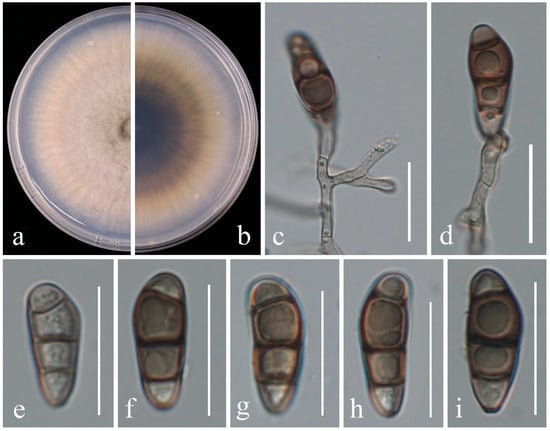 Curvularia austriaca (JZB3720002). (a) an upper view of colonies on the PDA; (b) reverse view of colonies on the PDA; (c,d) conidiogenous cells and conidia; (e–i) conidia. Scale bars: (c–i) =20 μm.
