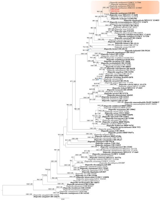 The phylogenetic tree of Diaporthe was constructed using five gene sequences (ITS, tef, tub, cal, and his), including 108 reference isolates representing 66 taxa in the Diaporthe sojae species complex [32]. The tree is rooted with D. amygdali isolates (CBS 126679 and CBS 115620). The tree topology of the ML analysis was similar to the Bayesian analysis. The best-scoring RAxML tree with a final likelihood value of −27986.001494 is presented (Figure 6). The matrix had 1208 distinct alignment patterns, with 19.34% of undetermined characters or gaps. Estimated base frequencies were as follows: A = 0.214688, C = 0.319197, G = 0.242643, T = 0.223473; substitution rates AC = 1.222391, AG = 3.869013, AT = 1.482265, CG = 1.021922, CT = 5.320754, GT = 1.000000; gamma distribution shape parameter α = 1.100460. The topology of the tree is consistent with the recent phylogenies of the recent study [32]. Our two isolates clustered with representative strains of D. unshiuensis (Figure 6).
