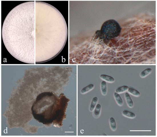 Diaporthe unshiuensis (JZB320309). (a) an upper view of colonies on the PDA; (b) reverse view of colonies on the PDA; (c) conidiomata sporulating on PNA; (d) cross section of conidiomata; e alpha conidia. Scale bars: (d) =100 μm; (e) =10 μm.