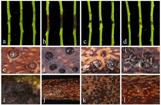 Pathogenicity assay on Vaccinium corymbosum shoots (a–d). (a) Control treatment, (b) inoculated by Diaporthe unshiuensis, (c) inoculated by Curvularia austriaca, (d) inoculated by Colletotrichum temperatum, (e–h) Conidiomata of Diaporthe unshiuensis on the shoot lesions, (i) mycelia of Curvularia austriaca on the shoot lesion, (j) Ascomata and conidiomata produced by Colletotrichum temperatum on the shoot lesion, (k) Ascomata of Colletotrichum temperatum on the shoot lesion, (l) Conidiomata of Colletotrichum temperatum on the shoot lesion.