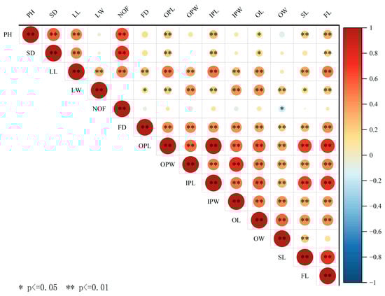 Correlation heatmap of quantitative traits in the F1 hybrid population. Red: positive correlation; deeper shades indicate stronger correlations. Blue: negative correlation; deeper shades indicate stronger correlation significance. Levels: p ≤ 0.05 (*), p ≤ 0.01 (**).