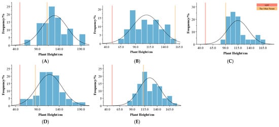 Frequency distribution of plant heights in the F1 hybrids of different combinations. (A–E) represent different combinations. The vertical orange line represents the value for Lilium davidii var. unicolor, and the pale orange line represents the value for the other parent.