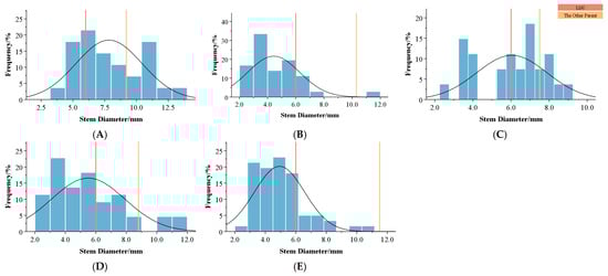 Frequency distribution of stem diameters in the F1 hybrids of different combinations. (A–E) represent different combinations. The vertical orange line represents the value for Lilium davidii var. unicolor, and the pale orange line represents the value for the other parent.