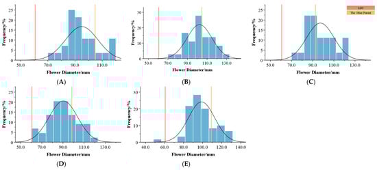 Frequency distribution of flower diameters in the F1 hybrids of different combinations. (A–E) represent different combinations. The vertical orange line represents the value for Lilium davidii var. unicolor, and the pale orange line represents the value for the other parent.