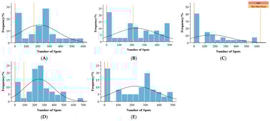 Frequency distribution of the number of spots in the F1 hybrids of different combinations. (A–E) represent different combinations. The vertical orange line represents the value for Lilium davidii var. unicolor, and the pale orange line represents the value for the other parent.