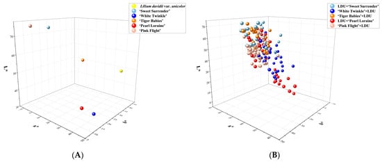 Flower color variations were observed across all five hybrid combinations. The L*, a*, and b* values of parental and hybrid progeny flower colors were measured using a spectrophotometer. A three-dimensional scatterplot was generated to visualize the distribution of these values (Figure 8). Parental lines exhibited significant differences in L*, a*, and b* values. For instance, ‘Sweet Surrender’ and ‘Pink Flight’ showed markedly higher brightness (L*) than the other parents, while their redness (a*) values were significantly lower. The yellowness (b*) value of Lilium davidii var. unicolor was notably higher than that of the other parents (Figure 8A). The hybrid progeny exhibited considerable variation in flower color distribution and the distribution is more concentrated in regions with higher brightness (L*) and yellow–blue component (b*) values (Figure 8B).
