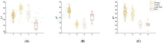 The boxplot of the distribution range of L*, a*, and b* values for different clusters. (A–C) represent L*, a*, and b* values. Numbers 1 to 4 on the x-axis represent different color clusters.