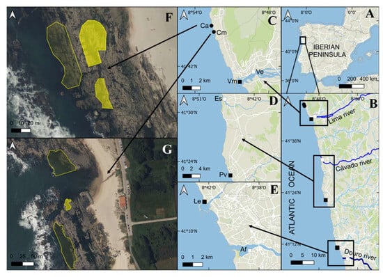 This study encompassed the north of Portugal from the Minho to the Douro estuaries (Figure 1A). This area is characterized by an almost straight coastline dominated by rocky shores, sandy beaches and mixed shores of rock and sandy patches. The coastline is interrupted by estuaries of different sizes, being the Lima, Cavado and Douro estuaries among those with the biggest size (Figure 1B). Due to its orientation, the coastline is very exposed to wave action, with the dominant swell directions being west and northwest, and a typical wave height between 1.5 and 2 m, reaching maximum values of about 7 m during winter storms. The north coast of Portugal shows a semidiurnal tidal regime, with the largest spring tides of about 3.5–4.0 m. The studied area is also subjected to a seasonal upwelling during the spring–summer period, which enhances primary production due to an increased nutrient supply [41].