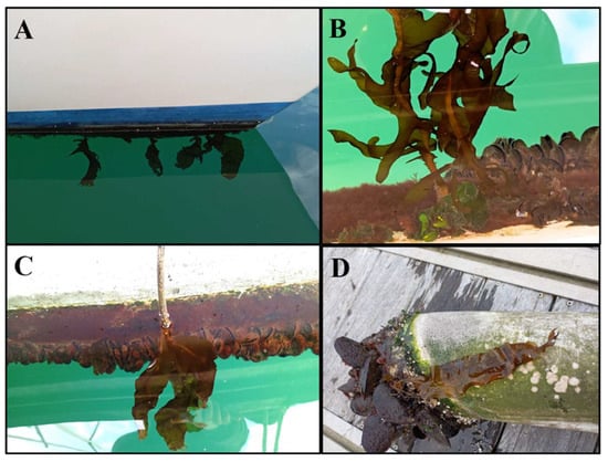 Individuals of Undaria were found on many different substrates such as boat hulls (Figure 2A), pontoons (Figure 2B), ropes (Figure 2C) or buoys (Figure 2D).