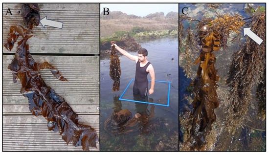 (A) Undaria pinnatifida overgrowing mussels in marinas; the white arrow shows mussels. (B) Undaria pinnatifida collected from natural rocky shores. (C) Undaria pinnatifida overgrowing native canopies; the white arrow shows the Undaria holdfast over the native canopy.