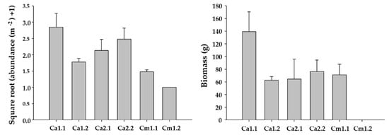 Mean values ± S.E. of the density and biomass of Undaria pinnatifida individuals found in the three studied natural localities. On the abscissa axis, the shores of Carreço (Ca) and Canto Marinho (Cm) are indicated. The first number indicates the locality, and the second number represents the site within each locality.