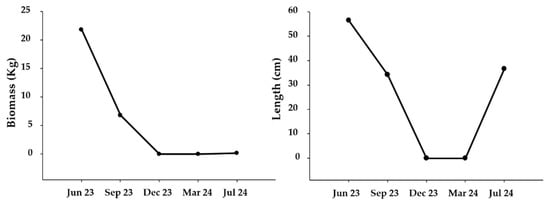 During the first experimental removal, in June 2023, a total of 21.8 kg of Undaria was removed, with a medium individual length of 56.5 ± 19.5 cm (Figure 7). No individuals of Saccharina latissima (Linnaeus) C.E. Lane, C. Mayes, Druehl & G.W. Saunders, 2006 were found in this first removal. Therefore, the total elimination of S. latissima from the area can be considered the first negative impact of Undaria on native macroalgal species in Portugal. During the second experimental removal (i.e., September 2023), the amount of removed Undaria (7 kg) and its medium length (34.2 ± 15.4 cm) decreased (Figure 7). Moreover, two individuals of S. latissima about 40 cm in length were found on the floating pontoon of the marina. During the next two experimental removals (i.e., December 2023 and March 2024), no individuals of Undaria were found. However, two senescent individuals of S. latissima, different from those observed in September, were found in December. Additionally, one individual of S. latissima of 37 cm was found in March. Finally, in June 2024, 0.17 kg of Undaria with a medium length of 36.6 ± 10.04 cm was removed. On this last date, two individuals of S. latissima, about 22 and 35 cm long, were found.