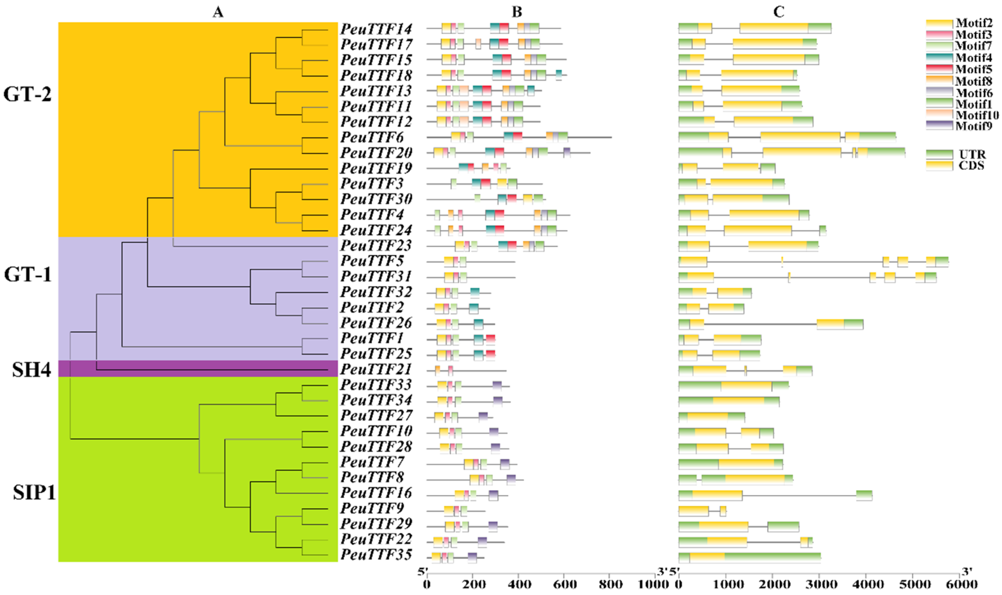 2.1. Identification of the Trihelix Transcription Factor Genes in PeuTTF Proteins