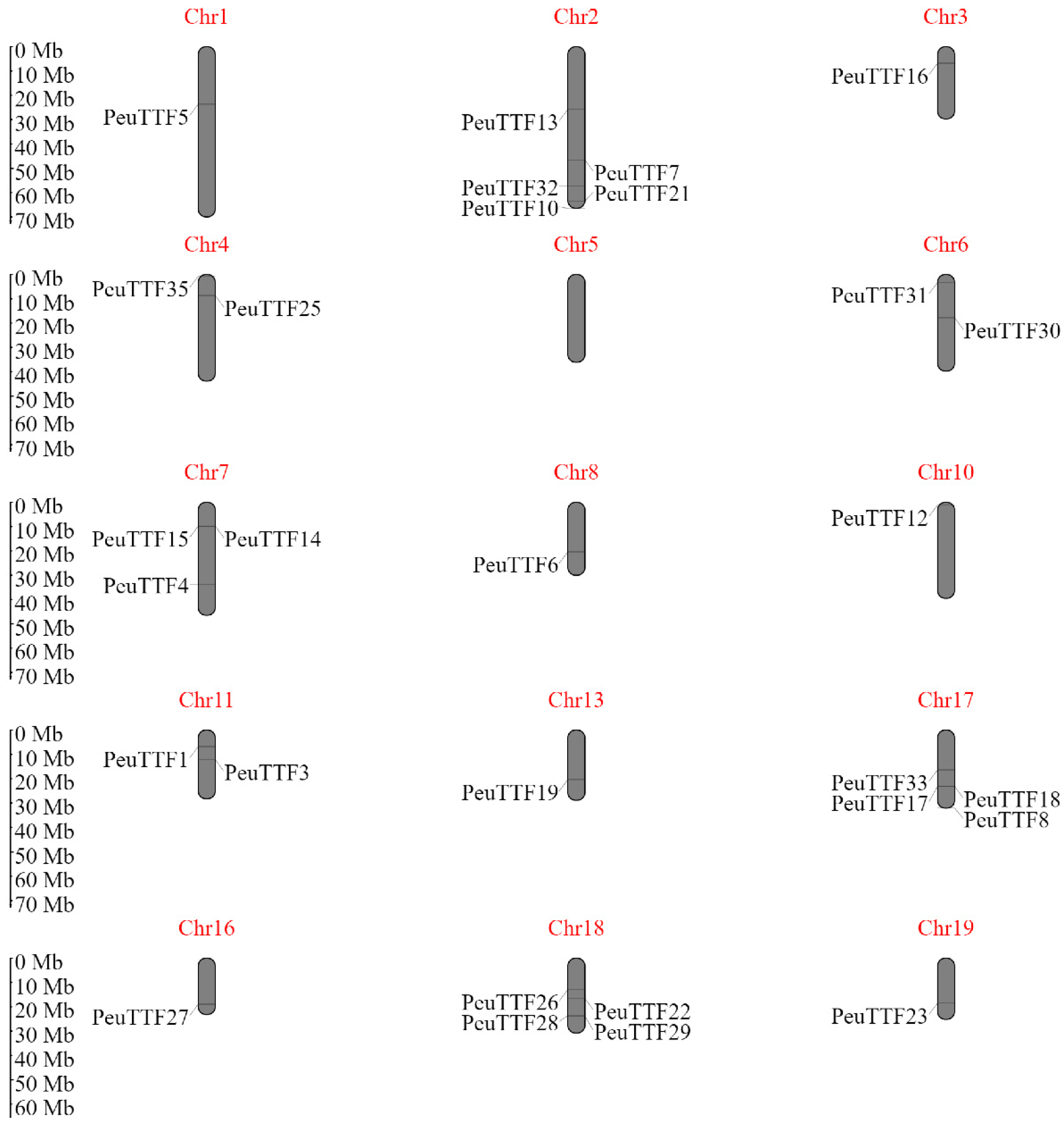 4.2. Identification and Characterization of PeuTTF Gene Family