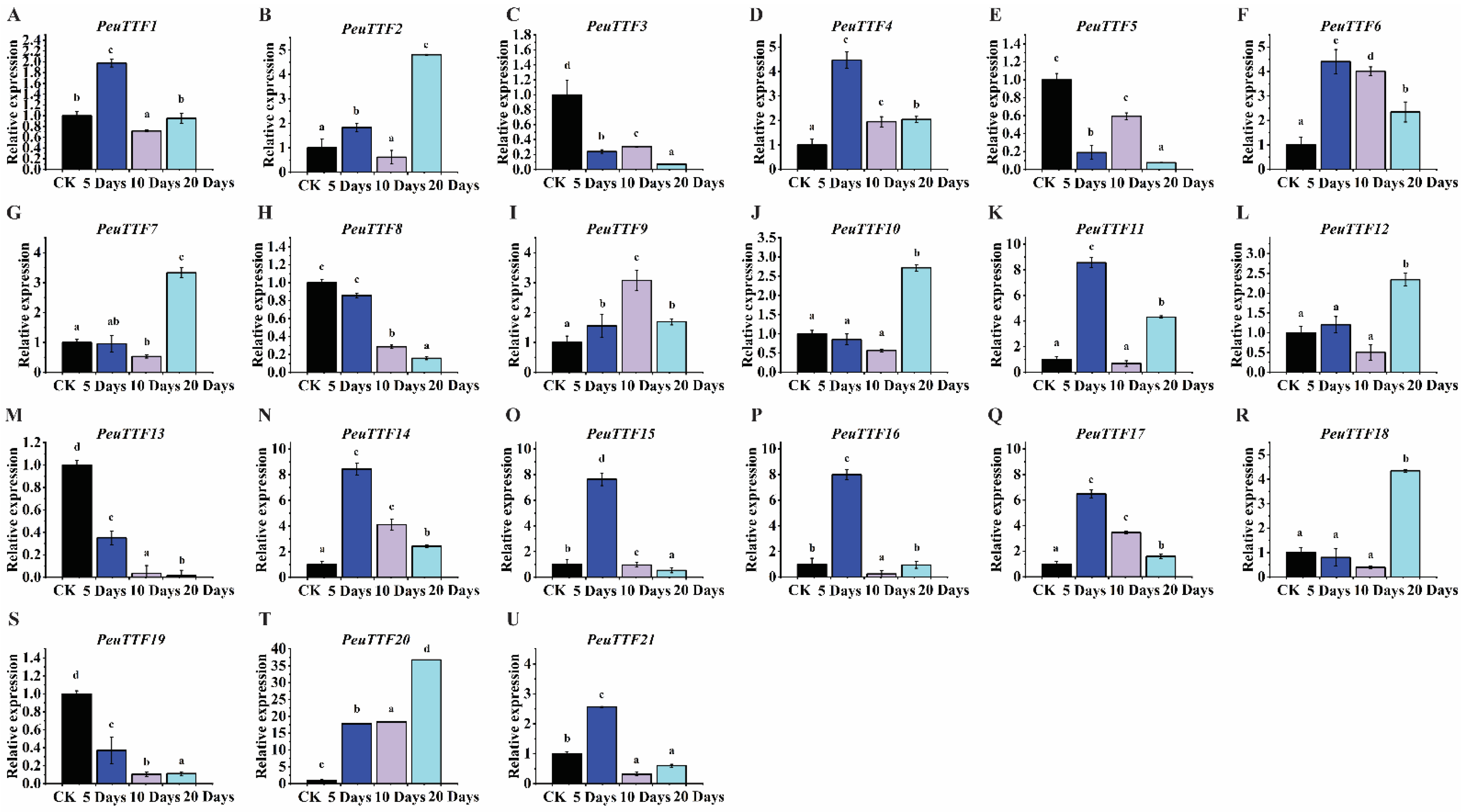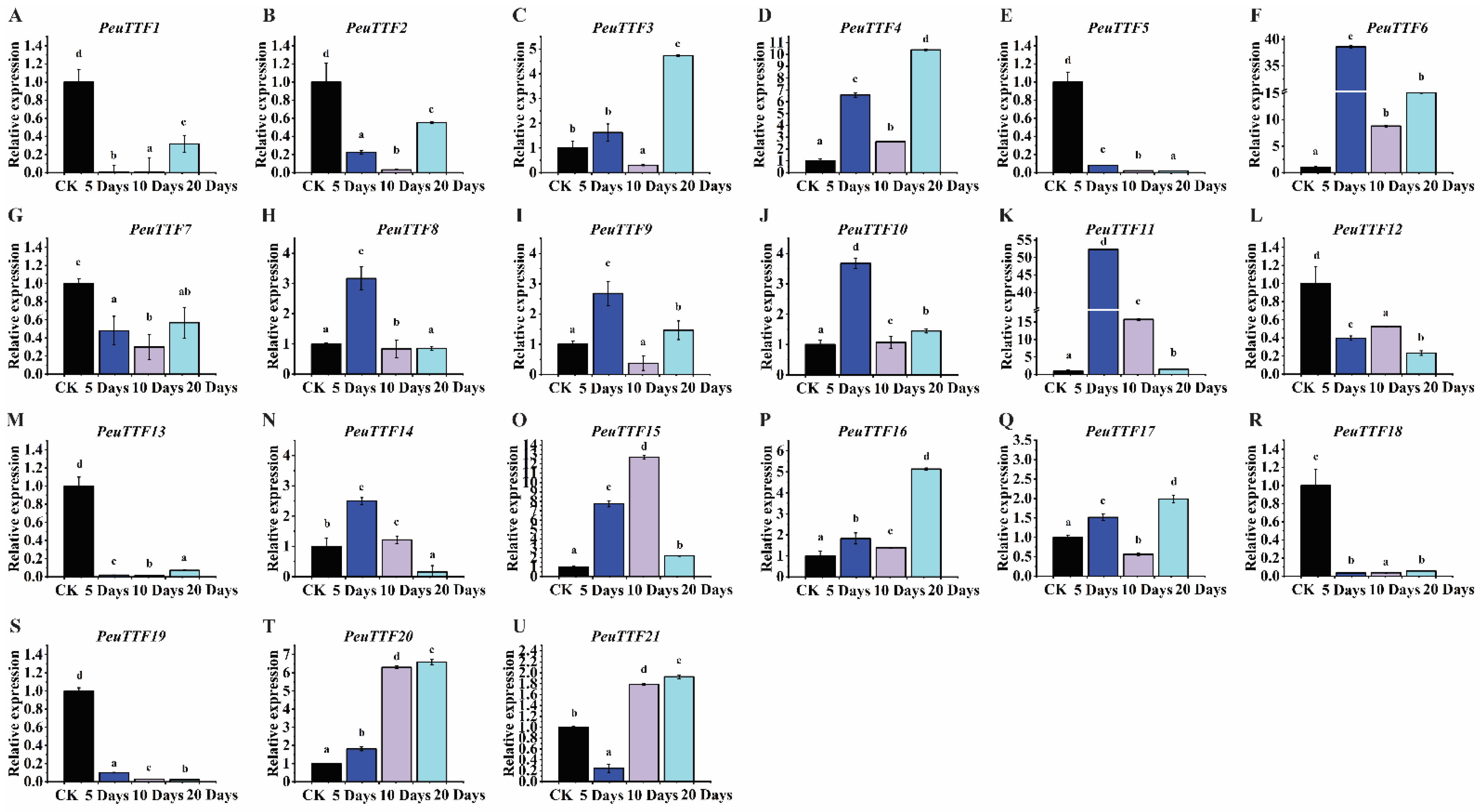 2.6. Examination of the Expression of PeuTTF Genes Utilizing RT-qPCR Analysis