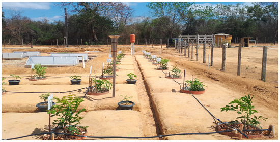 The plants were randomly allocated in the field, each in its own lysimeter, to avoid interference among them, and the blocks were randomized to standardize the experimental conditions. The irrigation water was prepared by adding NaCl to adjust the electrical conductivity levels, while the environmental conditions were monitored and measured daily to ensure uniformity of the treatments throughout the experiment.