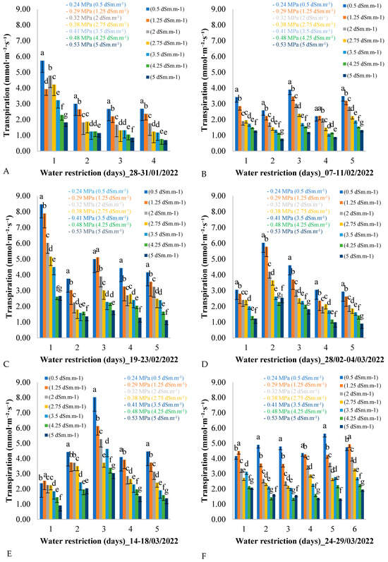 (A–F) Leaf transpiration throughout the days of the measurement cycle, from 6:00 a.m. to 6:00 p.m., in plants under different electrical conductivities and water potentials of the irrigation water for the period from 28 January to 29 March from 2022. Equal letters on bars for the same day indicate no difference between them by the Tukey test at 5% probability (p < 0.05).
