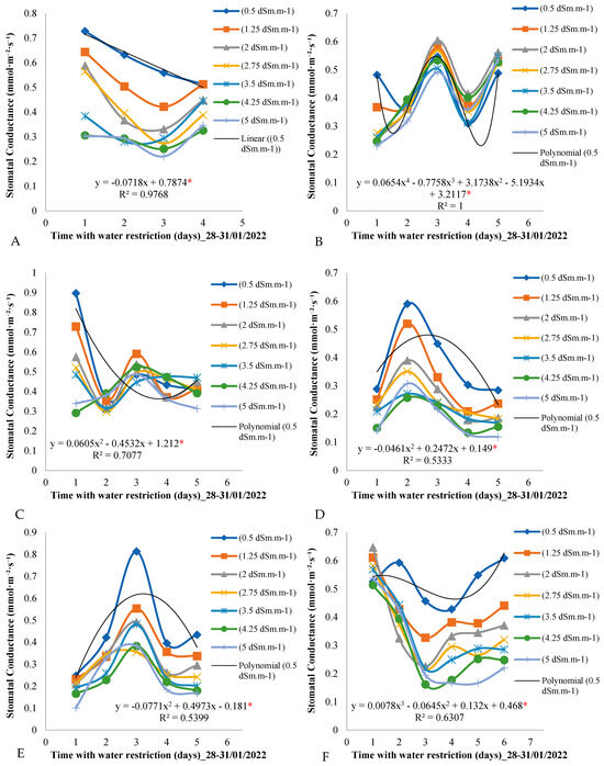 (A–F) Stomatal conductance throughout the days of the measurement cycle, from 6:00 a.m. to 6:00 p.m., in plants under different electrical conductivities of the irrigation water for the period from 28 January to 29 March from 2022. * Significant according to Tukey’s test at a 5% probability level (p < 0.05).