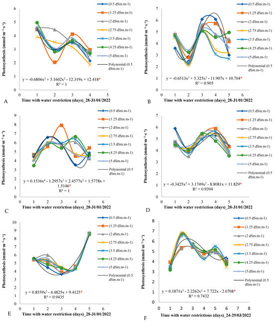(A–F) Photosynthesis throughout the days of the measurement cycle, from 6:00 am to 6:00 pm, in plants under different electrical conductivities of the irrigation water for the period from 28 January to 29 March 2022. * Significant according to Tukey’s test at a 5% probability level (p < 0.05).