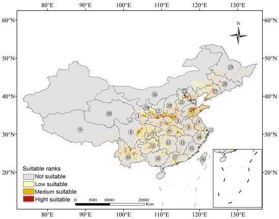 Based on the MaxEnt model, highly suitable habitats (p > 0.75) cover approximately 1.05 × 105 km2, representing 1.14% of China’s total land area (Table 1; Figure 1). These areas are primarily distributed across eastern and central China, including eastern Hubei, central Shaanxi, Shandong, eastern Sichuan, western Chongqing, western and central Henan, and southern Beijing (Figure 1). Additionally, moderately suitable areas (0.50 ≤ p ≤ 0.75) span about 2.38 × 105 km2 (2.57% of China’s land), predominantly located in Hubei, Sichuan, Gansu, southern Hunan, central and southern Shandong, northern Henan, and extensive regions of Yunnan. Low-suitability areas (0.25 ≤ p < 0.50) account for 8.06 × 105 km2 (8.69% of China’s total area) and are distributed across provinces that also contain highly and moderately suitable habitats.