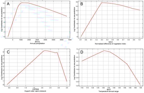 Figure 2. Response curves depicting the effects of key environmental predictors on Sorbus alnifolia in the species distribution model. (A) Annual precipitation (BIO12, mm); (B) normalized difference of vegetation index (NDVI); (C) August water vapor pressure (VAPR08, kPa); and (D) temperature annual range (BIO7, °C).