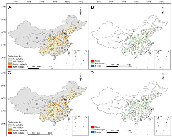 Figure 3. Predicted potential distribution map of Sorbus alnifolia under the SSP 245 climate change scenario: the projection for (A) 2041–2060 and (C) 2081–2100; and a comparison of the current distribution (see Figure 1) with (B) the 2041–2060 projection and (D) the 2081–2100 projection. ① Gansu; ② Shaanxi; ③ Henan; ④ Jiangsu; ⑤ Anhui; ⑥ Hubei; ⑦ Chongqing; ⑧ Sichuan; ⑨ Xizang; ⑩ Yunnan; ⑪ Guizhou; ⑫ Hunan; ⑬ Jiangxi; ⑭ Zhejiang; ⑮ Fujian; ⑯ Taibei; ⑰ Guangdong; ⑱ Guangxi; ⑲ Ningxia Hui Autonomous Region; ⑳ Shanxi; ㉑ Hebei; ㉒ Beijing; ㉓ Tianjin; ㉔ Shandong; ㉕ Shanghai; ㉖ Inner Mongolia Autonomous Region; ㉗ Liaoning; ㉘ Jilin; ㉙ Heilongjiang; ㉚ Qinghai.