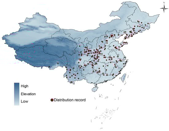 Occurrence data for S. alnifolia were compiled from online herbarium databases, including the Chinese Virtual Herbarium (CVH; [65]), Tropicos [66], and GBIF [67]. These sources are widely recognized for their comprehensive and up-to-date plant occurrence (and/or specimen) data. Nevertheless, some biases may exist due to geographical clustering in regions with higher research efforts and easier access. We hence excluded records without a specified collection site, and for specimens that only provided a location name we determined the longitude and latitude using Google Maps. For all occurrence data, we ensured the accuracy of the locations by verifying their coordinates via Google Maps. During this process, we excluded occurrences from cultivated areas and kept only those from natural habitats. Although we cannot completely rule out the possibility that some occurrences in forested areas are cultivated, this approach helped to minimize the impact of human cultivation (such as irrigation) on the reliability of the subsequent model results. After eliminating duplicate collection sites, we applied spatial filtering to the remaining points to retain only one occurrence within each 1.0 × 1.0 km grid cell. This resolution was chosen to match the 30 arc-seconds climate data resolution (below), ensuring consistency between the occurrence data and environmental variables. This filtering process resulted in 198 occurrence points for modeling the distribution of S. alnifolia (Figure 4).
