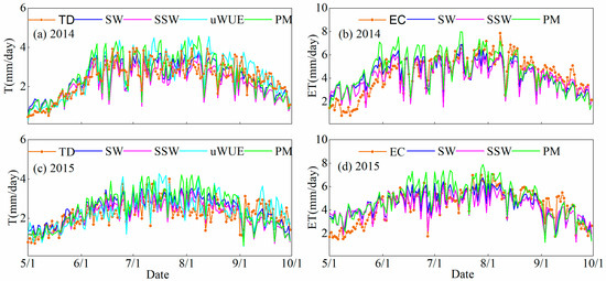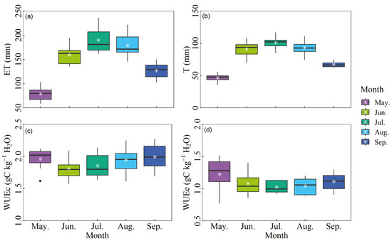 2.3. Seasonal Variations in ET, T, WUEc, and WUEe