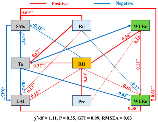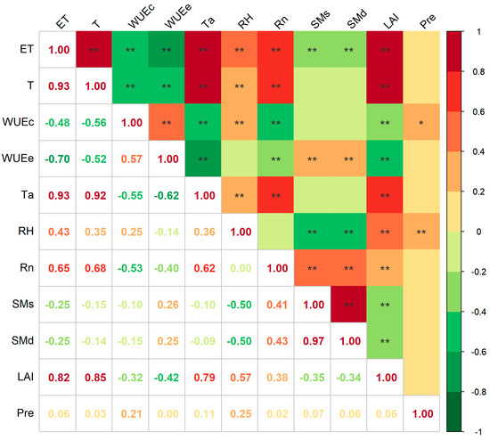 2.4. Responses of ET, T, WUEc, and WUEe to Influencing Factors