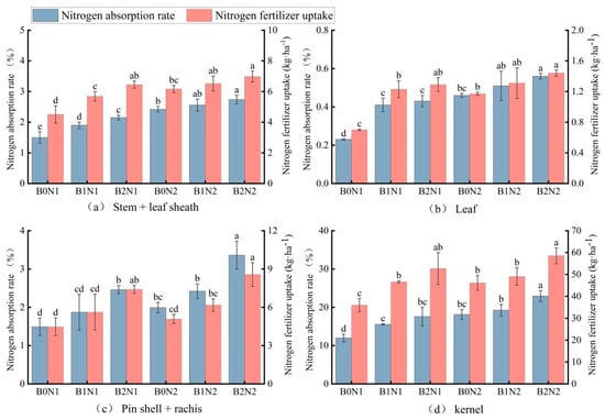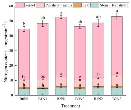 Nitrogen accumulation in aboveground organs of plants at maturity stage. Note: Different letters indicate significant differences (p < 0.05) among the treatments of biochar and nitrogen fertilizer application, while the same letters indicate no significant differences among the treatments.