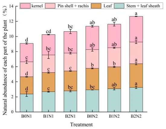 15N abundance in aboveground organs of spring wheat plants at maturity stage. Note: Different letters indicate significant differences (p < 0.05) among the treatments of biochar and nitrogen fertilizer application, while the same letters indicate no significant differences among the treatments, which is the same as below.