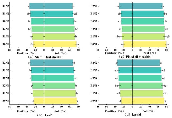 Absorption proportion of 15N-labeled fertilizer N and soil N in plant at maturity stage (%). Different N fertilizer sources for (a) stem + leaf sheath, (b) leaf, (c) pin shell + rachis, and (d) kernel. Different letters indicate significant differences (p < 0.05) among the treatments.