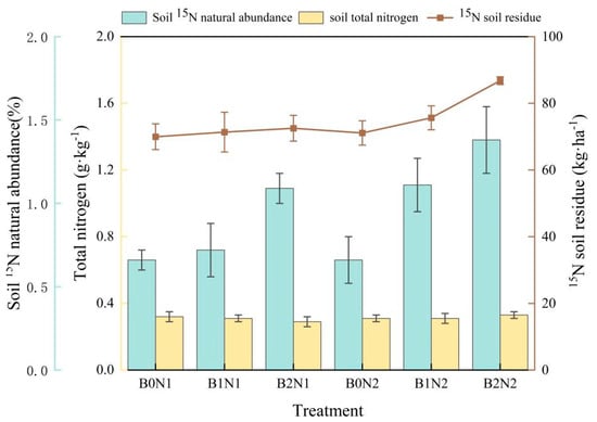 The effects of biochar application and N fertilizer rate optimization on the natural abundance of 15N-labeled fertilizer N, soil total N content, and 15N soil residue were significantly different (p < 0.05). Biochar application promoted an increase in 15N abundance and its soil residue (Figure 5), which was even greater under reduced N fertilizer conditions. The highest 15N abundance and 15N soil residue were found under the B2N2 treatment, with respective rates of 1.38% and 86.80 kg·ha−1, compared with other treatments. Under reduced N fertilizer application (N2), the total N content in soil at a depth of 0–30 cm increased with the increase in biochar application. The highest soil total N content was 0.33 g·kg−1 under the B2N2 treatment, and the difference between treatments was not significant.