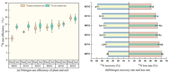 Fate of fertilizer N. (a) Utilization rate of 15N-labeled fertilizer N of plants and soil. (b) Total recovery rate and loss rate of 15N. Different letters indicate significant differences (p < 0.05) among the treatments.