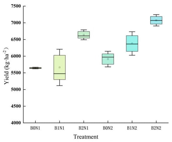 Biochar application and N fertilizer rate optimization affected the yield of spring wheat and its components (Figure 7). Under the same N application conditions, the number of grains, number of spikes, and yield of spring wheat showed an increasing trend with the increase in biochar application. Under the same charcoal application conditions, the number of grains in spikes, the number of spikes, and the yield of spring wheat all showed an increasing trend with the reduction in N fertilizer. Under the B2N2 treatment, the number of grains in spikes and the yield of spring wheat showed the best performance, at 41.90 and 7075.54 kg·ha−1, respectively. These values increased by 9.69–28.25% and 10.91–25.35%, respectively, compared with the other treatments.