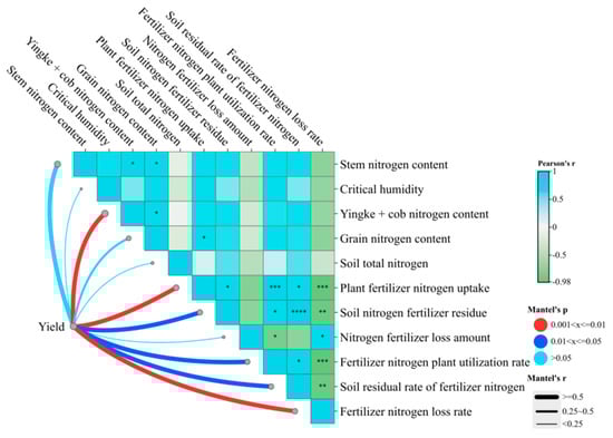 Analysis of the relationships between yield and N content of the plant, N absorption of plant fertilizer, and N loss rate. Different colors in the figure indicate whether the correlation between different indicators is significant, where “*” indicates a weak correlation; ** indicates moderately relevant. “***” indicates strong correlation; “****” is very relevant. The p-value is used to test whether the correlation is significant. The meaning is as follows: the red line is 0.001 < x ≤ 0.01, indicating a very significant correlation; The dark blue line indicates 0.01 < x ≤ 0.05, indicating a significant correlation; The sky blue line is x > 0.05, indicating no significant correlation.