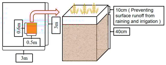 A microarea of size 0.3 m2 was set up by placing bottomless galvanized iron with a length of 0.6 m, width of 0.5 m, and height of 0.5 m in the middle of the corresponding plot. The soil was plowed to a depth of 40 cm before sowing wheat in the spring of 2023, leaving 10 cm exposed on the ground surface to prevent the loss of the 15N-labeled N fertilizer during irrigation (Figure 9). The 0–20 cm topsoil in the microarea was removed, mixed with the 15N-labeled fertilizer, and backfilled into the microarea, the surface was flattened and compacted, and then the wheat was sown. Fertilizer was applied in a 5:5 base ratio, followed by a 6:4 ratio at the nodulation and spike stages, with no additional fertilizer applied thereafter. Biochar was evenly spread on the ground as a base fertilizer in April 2021. Then, the biochar was manually turned evenly into the tillage layer at a soil depth of 30 cm, with no further application at later stages. Soil and plant sampling for this experiment took place during the April–August 2023 spring wheat growing season.
