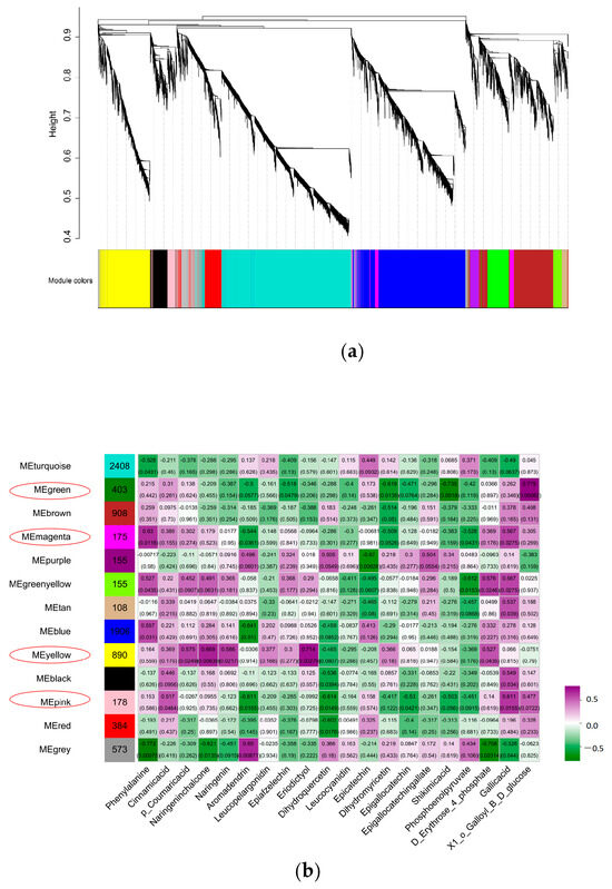 After screening the genes with small expression fluctuations, a total of 8547 genes were classified by WGCNA into 13 co-expression gene modules, which were defined as turquoise, gray, green, brown, magenta, purple, green-yellow, tan, blue, yellow, black, pink, and red, with module sizes ranging from 108 to 2408 (Figure 10a). Through visual analysis of the correlation between 13 modules and 20 metabolites, turquoise module genes had the largest number (2408) and tan module genes had the smallest number (108); the green module was significantly correlated with 1-O-Galloyll-β-d-glucose. Yellow was associated with 10 flavanol metabolites, among which 2 flavanol compounds had the highest correlation (r = 0.6, p < 0.05). The magenta module was positively correlated with phenylalanine (r = 0.63, p < 0.05). The pink and gray modules were significantly positively correlated with gallic acid and aromadendrin, respectively, and the yellow module was significantly correlated with naringenin chalcone and eriodictyol (Figure 10b). Genes with high connectivity were defined as hub genes, and the top 50 genes with the highest connectivity among the four modules were selected according to the characteristic gene connectivity (KME) values to construct a co-expression network, which was visualized by Cytoscape 3.10 software (Figure 10c), and TFs were selected as the key hub genes. A total of four TFs were identified in the green module, namely two MYB (HD.06G0008880, HD.04G0021130), one ERF (HD.14G0004490), and one WRKY (HD.11G0000850). One WRKY TF (HD.01G0021500) was identified in the magenta module. A total of eight TFs were identified in the yellow module, including one NAC (HD.14G0006210), one MYB (HD.06G0033760), one WRKY (HD.12G0001660) and five ERFs (HD.01G0015340, HD.01G0015360, HD.02G0033890, HD.06G0019520, HD.12G0014330). One MYB (HD.03G0018510) and one WRKY (HD.03G0017510) TFs were identified in the pink module. Therefore, the expression of MYB 44 (HD.06G0033760) and WRKY 17 (HD.12G0001660) in L4 treatment negatively regulated the content of EGCG.