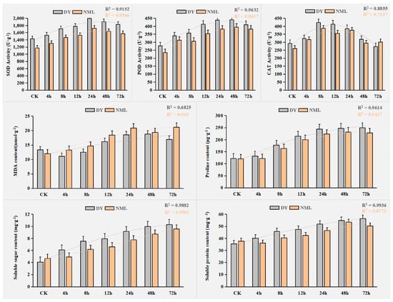 Changes in physiological indicators of H. fulva at different stages under heat stress (40 °C). CK represents the control treatment, where plants were not subjected to heat stress (40 °C); DY represents ‘Dan Yang’; NML represents ‘Nuo Mi Lu’. SOD stands for Superoxide Dismutase, POD stands for Peroxidase, CAT stands for Catalase, and MDA stands for Malondialdehyde. The abscissa represents time, which is 4 h, 8 h, 12 h, 24 h, 48 h, and 72 h, respectively. The ordinate represents the activity or content of each physiological index (unit: as shown in the figure). The R2 value in the figure represents the coefficient of determination of data fitting, reflecting the degree of data fitting.