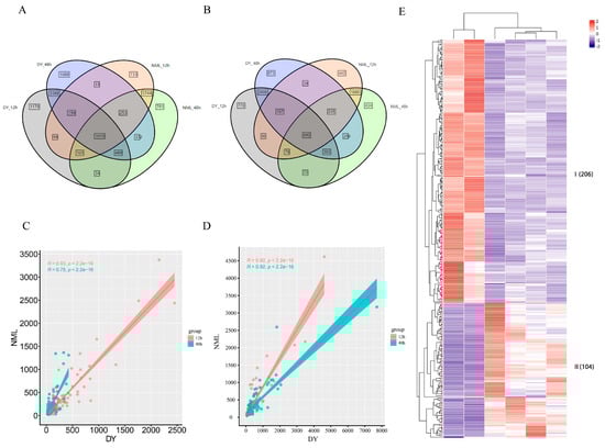 The differential expression genes in the transcriptome of Hemerocallis under heat stress. (A) Venn diagram representing the shared and unique upregulated genes in the heat stress response of H. fulva DEGs. (B) Venn diagram representing the shared and unique downregulated genes in the heat stress response of H. fulva DEGs. (C) Scatter plot of the gene expression correlation between ‘Dan Yang’ and ‘Nuo Mi Lu’ in Group I. (D) Scatter plot of the gene expression correlation between ‘Dan Yang’ and ‘Nuo Mi Lu’ in Group II. (E) Heat map of the transcript abundance of the shared genes. The columns from left to right are NML-CK, DY-CK, DY-48 h, NML-48 h, NML-12 h, and DY-12 h.