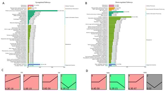 KEGG enrichment of heat-tolerance-related genes in H. fulva. (A,B) bar plots show pathway enrichment presented as number of upregulated and downregulated genes under heat stress vs. control. (C,D) show the changing trend in genes in the significantly enriched gene profile. The number in the lower left corner represents the significant p-value.