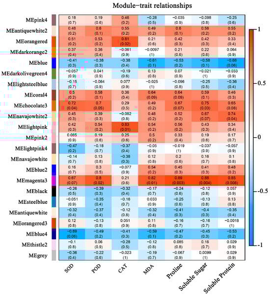 Correlation analysis between modules and phenotypes. SOD stands for Superoxide Dismutase, POD stands for Peroxidase, CAT stands for Catalase, and MDA stands for Malondialdehyde.