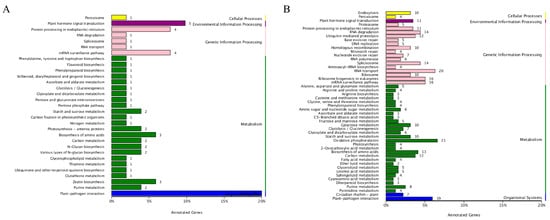 To reveal the specific functions of each module, a functional enrichment analysis was conducted for the genes in MElightpink and MEmagenta3 modules. The KEGG enrichment analysis of the MElightpink module showed significant enrichment of plant–pathogen interactions, plant hormone signal transduction, protein processing in the endoplasmic reticulum, and the mRNA surveillance pathway (Figure 5A). The MEmagenta3 module was significantly enriched in oxidative phosphorylation, RNA transport, plant–pathogen interactions, etc. (Figure 5B). Plant–pathogen interactions was the most significantly enriched in the two modules. Additionally, pathway enrichment analysis was conducted on the genes in the MEorangered module (Figure S3).