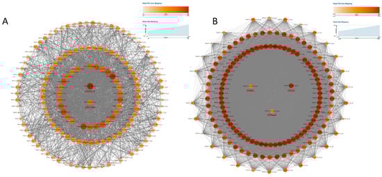 Gene co-expression network of heat-tolerance-related core transcription factors within the MElightpink (A) and MEmagenta3 (B) modules. The color and the size of the nodes represent the degree value (the degree of correlation among genes). The central point represents the core gene.