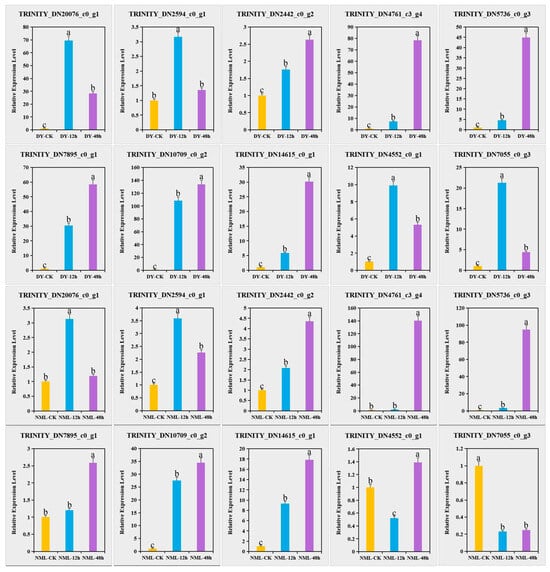 Identification of differentially expressed genes using qRT-PCR. This figure shows the relative expression levels of different genes in various samples. Among them, DY-CK, DY-12 h, and DY-48 h represent the control group, the 12 h treatment group, and the 48 h treatment group of the ‘Dan Yang’ (DY) variety, respectively; NML-CK, NML-12 h, and NML-48 h represent the control group, the 12 h treatment group, and the 48 h treatment group of the ‘Nuo Mi Lu’ (NML) variety, respectively. The ordinate of each bar chart is the relative expression level (Relative Expression Level). Non-identical letters reveal a notable shift between the experimental groups (p < 0.05).