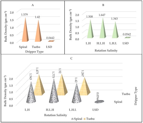 Figure 1. The effect of the type of dripper (A), the rotation salinity (B), and the interaction between them (C) on the soil bulk density values (g cm−3).