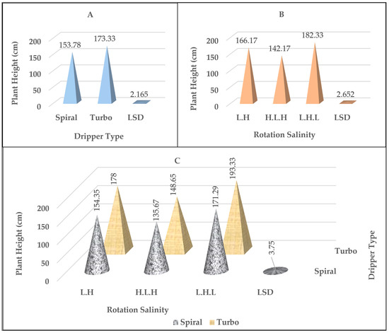 Figure 2. The effect of the type of dripper (A), the rotation salinity (B), and the interaction between them (C) on the values of plant height in cm.