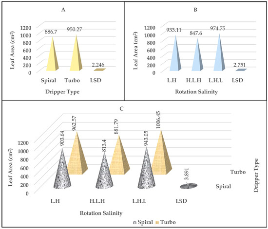Figure 3. The effect of the type of dripper (A), the rotation salinity (B), and the interaction between them (C) on the leaf area values in cm2.