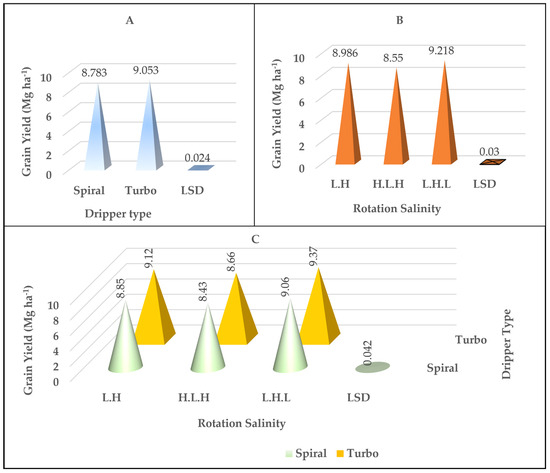 Figure 4. The effect of the type of dripper (A), the rotation salinity (B), and the interaction between them (C) on the values of grain yield in Mg ha−1.